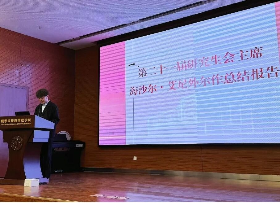 第二十一届研究生会主席海沙尔·艾尼外尔回顾了过去一年的工作。他强调,在学院党委领导、团委指导下,深入贯彻习近平总书记关于青年工作的重要思想,研究生会在打造品牌活动、深化榜样引领、搭建沟通平台等方面作出了突出贡献。他指出,通过“导师有约”、“翔宇实务讲堂”等学术交流活动,不仅促进了学风建设,还为同学们营造了良好的学习氛围;同时,“权益树洞”、“校园护航”专栏的设立也进一步加强了与同学们之间的联系,切实解决了大家的实际问题。