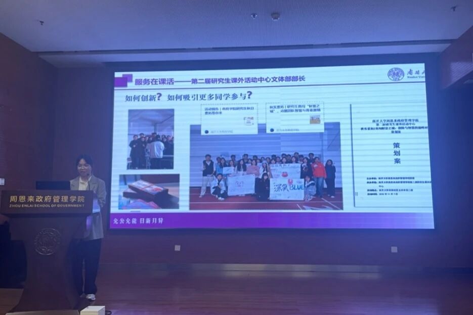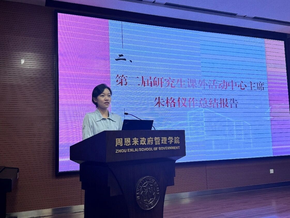 随后,第二届研究生课外活动中心主席朱格仪向大会工作报告,展示了课外活动中心在过去一年中的成长轨迹。研究生课外活动中心始终坚持以习近平新时代中国特色社会主义思想为指导,在学院党委团委的正确领导下,从健全内部管理到创新活动品牌,再到服务广大学生,课外活动中心通过一系列丰富多彩的文体活动,如“音符跳动,在音乐疗愈中感受心灵律动”心理团辅活动、“翔宇聚韵,筝绘南开”风筝制作活动等,既关注到了同学们的心理健康,又丰富了校园文化生活。