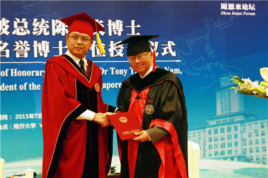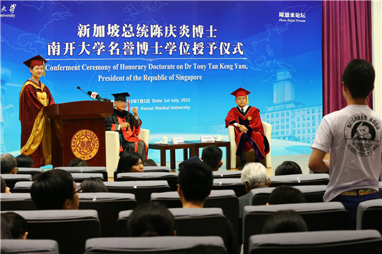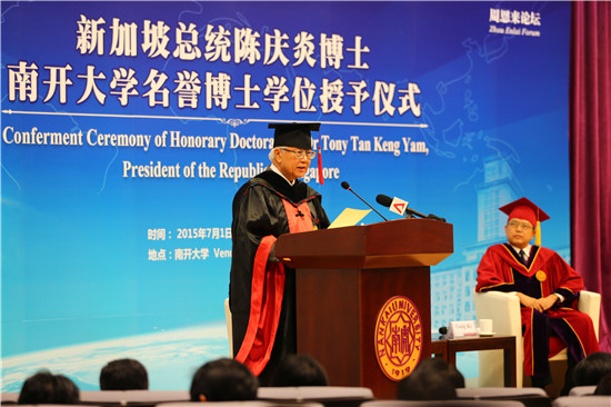 南开新闻网讯(记者 马超 摄影 任永华 吴军辉)应国家主席习近平邀请,新加坡共和国总统陈庆炎于6月29日至7月4日对中国进行国事访问。7月1日,陈庆炎及夫人一行访问我校,校长龚克代表学校向陈庆炎授予名誉博士学位。学位授予仪式在东方艺术大楼举行。