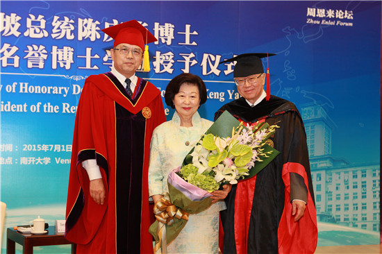 此前我校曾向国际数学大师陈省身、物理学家吴大猷、美国莱斯大学校长李达伟、台湾海峡两岸经贸文化交流协会荣誉会长江丙坤等8人授予名誉博士学位,陈庆炎是我校第9位名誉博士。《中华人民共和国学位条例》第十四条规定:对于国内外卓越的学者或著名的社会活动家,经学位授予单位提名,国务院学位委员会批准,可以授予名誉博士学位。至此,南开又添一位卓越的校友。正如龚克在致辞中所说:我们今天对陈庆炎总统授予名誉博士学位,必将有益于华人直播
